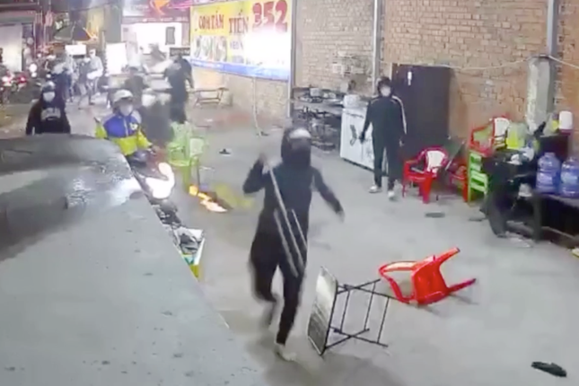 Camera ghi lại hình ảnh băng nhóm của Trường cầm cây ba chĩa xông vào tấn công người trong quán cà phê. Ảnh: A.X. |