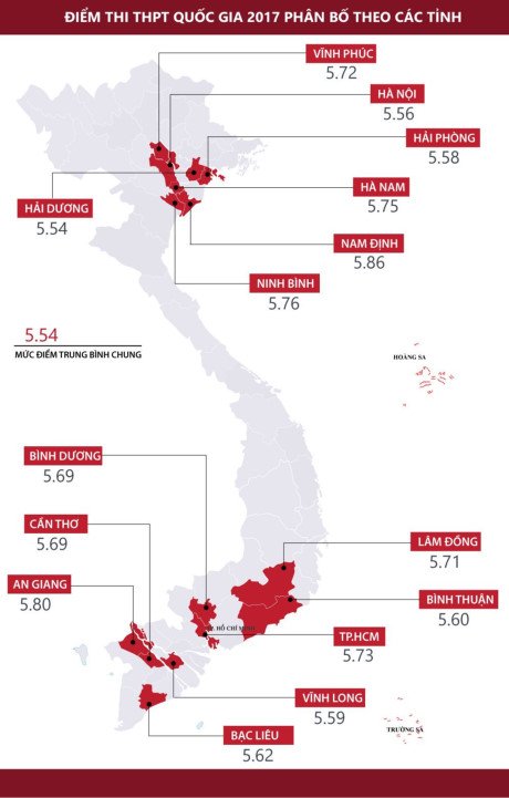 15 tỉnh thành phố có mức điểm trung bình cao nhất cả nước. Đồ họa: Lê Văn. (Bấm vào hình để xem ảnh kích thước lớn).