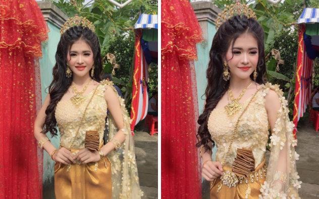 Mới đây, trong một nhóm đông thành viên trên mạng xã hội, hình ảnh một cô dâu xinh đẹp trong bộ trang phục cưới lộng lẫy đã khiến dân mạng xôn xao. Không giống như đa phần các cô gái hiện đại chọn mặc váy cưới trắng trong ngày trọng đại, cô dâu này diện đồ cưới truyền thống của dân tộc Khmer với mái búi tóc cao, đội vương miện vàng.