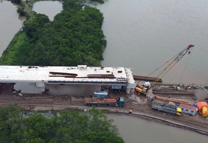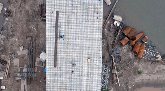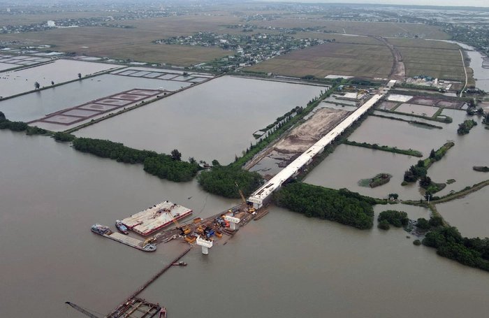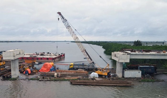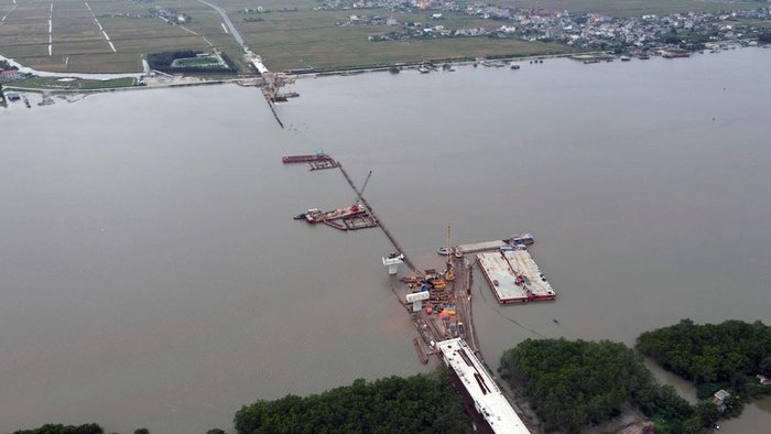 Hình ảnh thi công ở phía tỉnh Thái Bình với một đoạn mặt cầu đang được xây dựng.