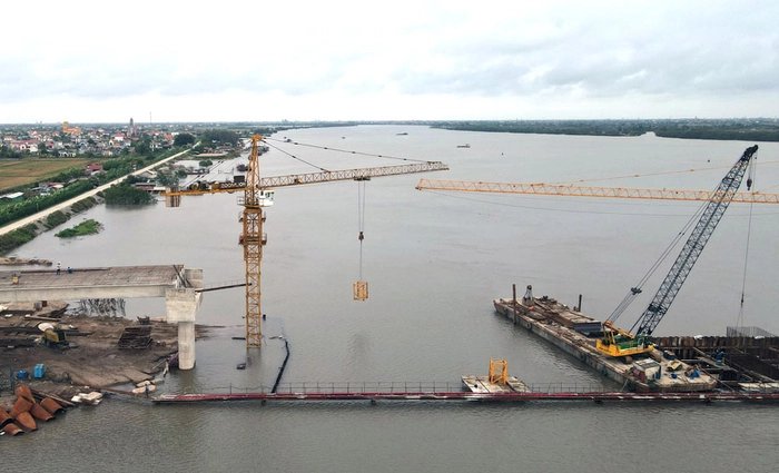 Hình ảnh cầu sông Hồng đoạn thuộc xã Nam Phú đang thi công.