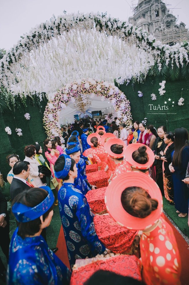 Ngay sau lễ cưới tại nhà thờ, cặp đôi đã tổ chức lễ ăn hỏi, đón dâu tại nhà riêng của cô dâu.
