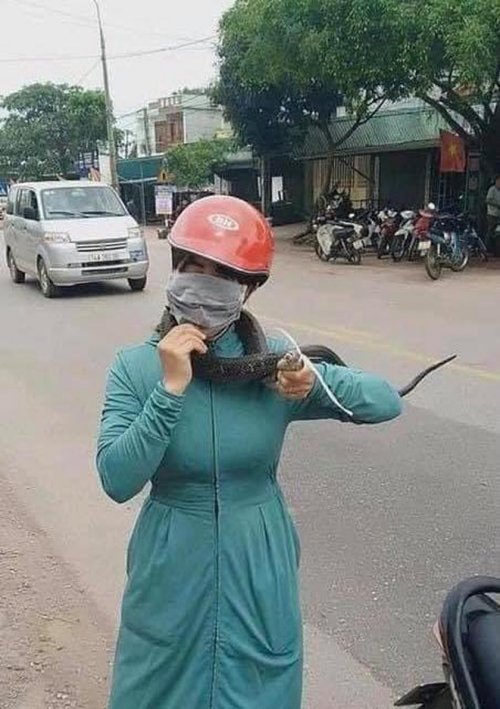 Mới đây trên mạng xã hội xuất hiện hình ảnh người phụ nữ, mặc áo chống nắng nhưng trên tay đang cầm một… con rắn khá lớn mà không hề sợ hãi.