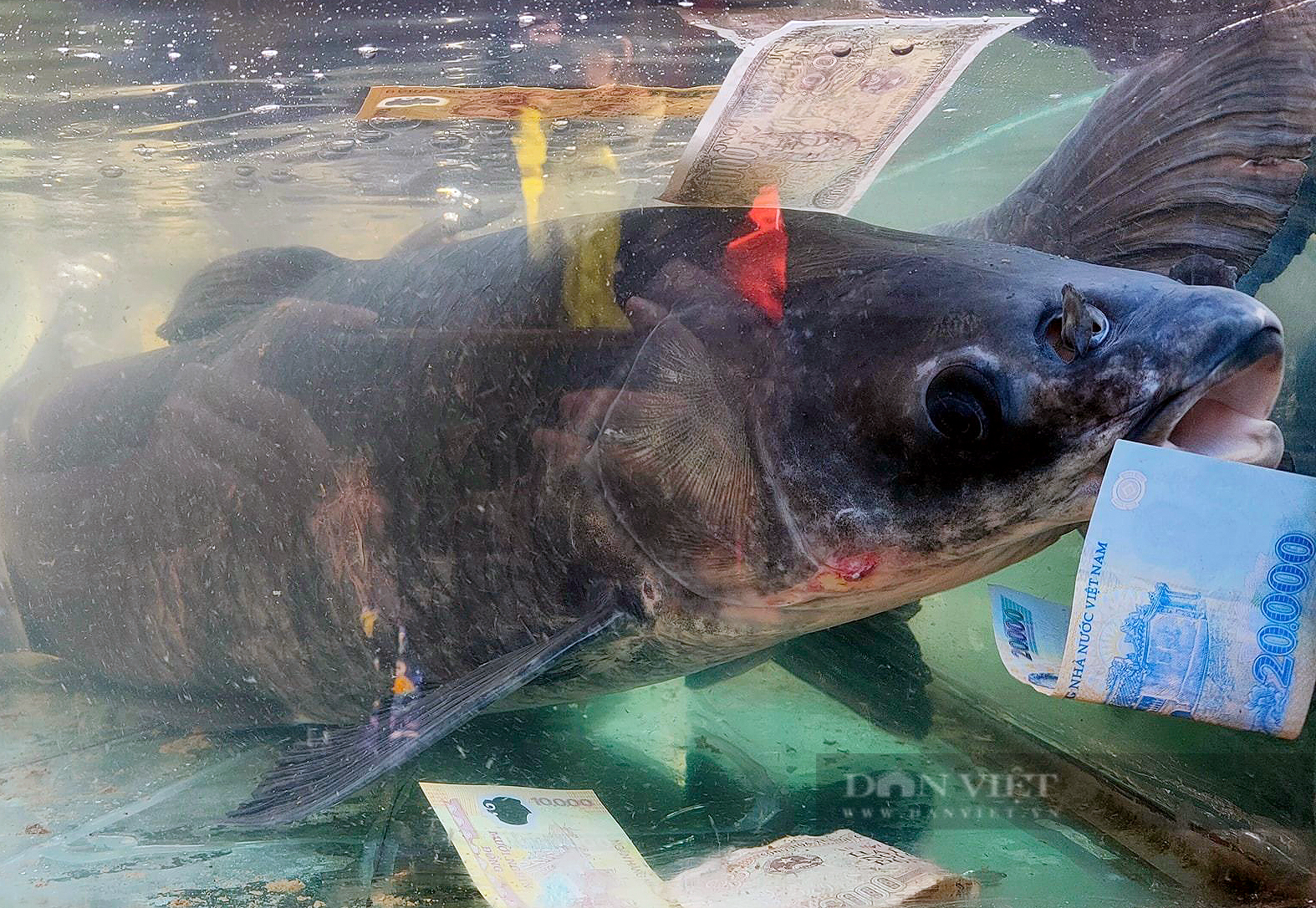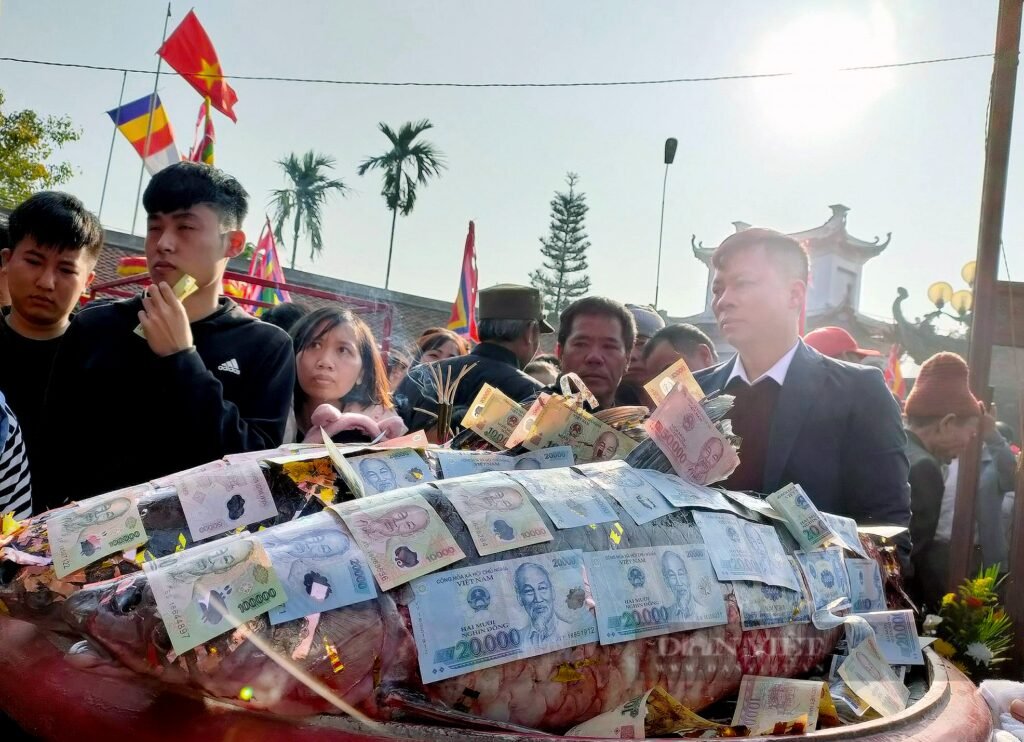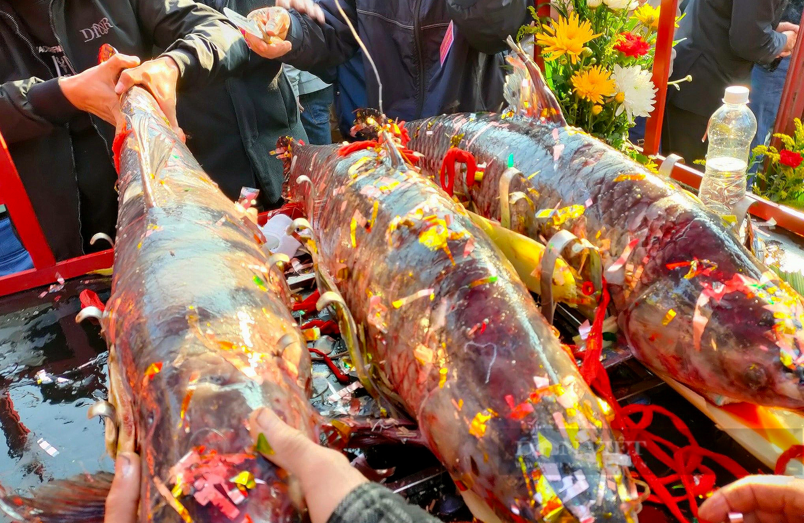 Cá trắm đen khổng lồ dùng để tế đức Linh thánh Long Kiều, mỗi con nặng khoảng 10kg, được thả trong bể gọi là “kiệu cá”. Nhiều người dân thả tiền lẻ vào để cầu may.