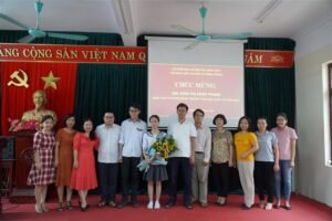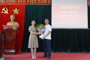 Thầy Vũ Văn Hợp nhận hoa chúc mừng từ Hiệu trưởng nhà trường
