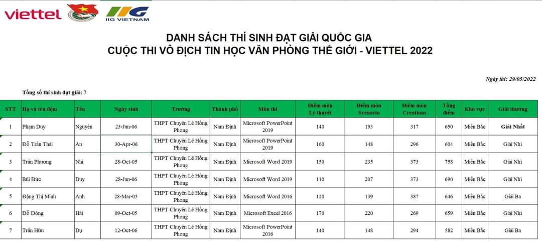 Học sinh Trường THPT chuyên Lê Hồng Phong tiếp tục trở thành tân vô địch quốc gia Cuộc thi Vô địch Tin học văn phòng Thế giới – Viettel 2022 và đại diện Việt Nam tranh tài tại vòng chung kết thế giới tổ chức tại Hoa Kỳ.