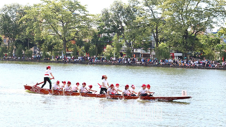 Các đội tranh tài trong ngày hội bơi chải truyền thống của tỉnh. Ảnh: Việt Thắng