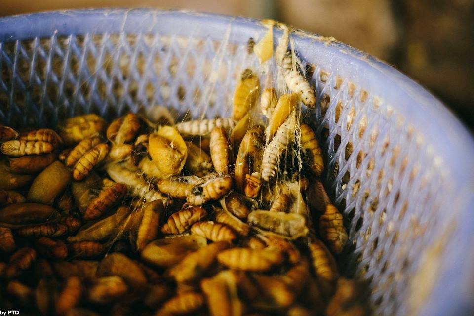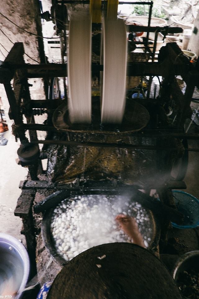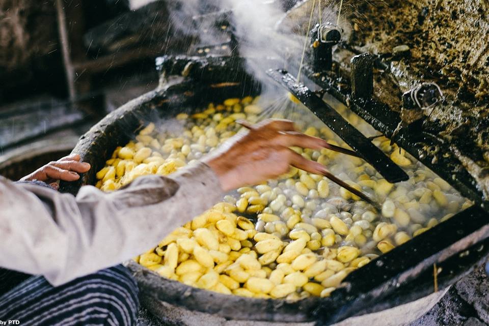 Người ta đổ nong kén tằm vào nước và đun cho nước sôi lên rồi tiếp tục đổ cả nồi nước sôi có kén tằm trong đó vào một hũ nước để bắt đầu công đoạn kéo tơ