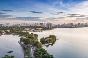 Quãng giữa đường Cổ Ngư có một con đường đất nhỏ và dài đi vào một bán đảo nhỏ nằm ngập trong bóng cây cổ thụ và giữa một biển sen lá xanh lá đỏ lay động trong gió hè đưa hương, đó là chùa Trấn Quốc có kiến trúc cổ kính.