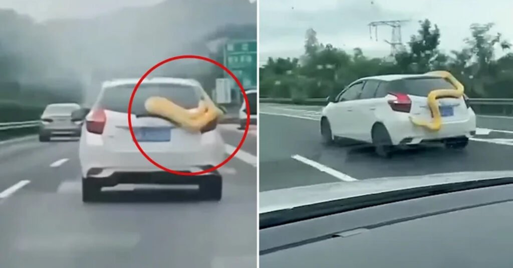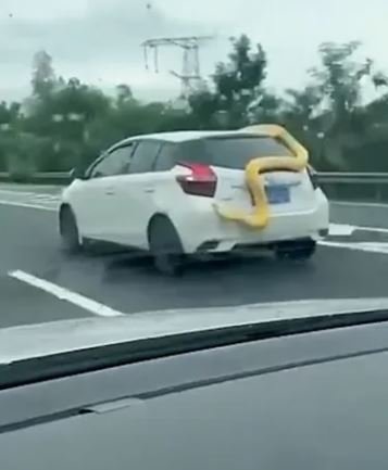 Mới đây, nhiều người dân tham gia giao thông trên tuyến đường cao tốc Yiyang, tỉnh Hồ Nam, Trung Quốc đã phải chứng kiến một cảnh tượng kinh hoàng. Trên con đường đông đúc, từng đoàn xe nối đuôi nhau đang chạy với tốc độ cao thì bỗng nhiên, từ một chiếc xe ô tô con màu trắng bỗng xuất hiện một con trăn to, khổng lồ màu vàng trườn ra.