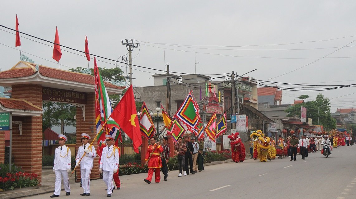 Đoàn rước dòng họ Trần Quốc Thể đi qua UBND xã Hải Phúc