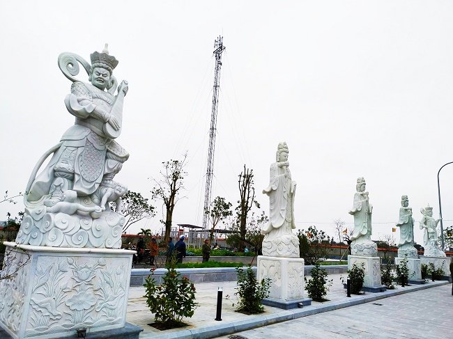 Hai bên bảo tượng là hệ thống 10 pho tượng gồm 6 pho tượng Phật Bồ Tát Quan Thế Âm, Bồ Tát Đại Thế Chí và 4 pho Tứ Thiên Vương cao 4m15 đá trắng nguyên khối kết hợp với những hàng cây xanh tạo nên một nét vẽ an tĩnh trong chốn thiền môn. 10 pho tượng Quan âm đứng uy nghi, tạo thế oai hùng xung quanh bảo tượng Đức Phật A Di Đà.