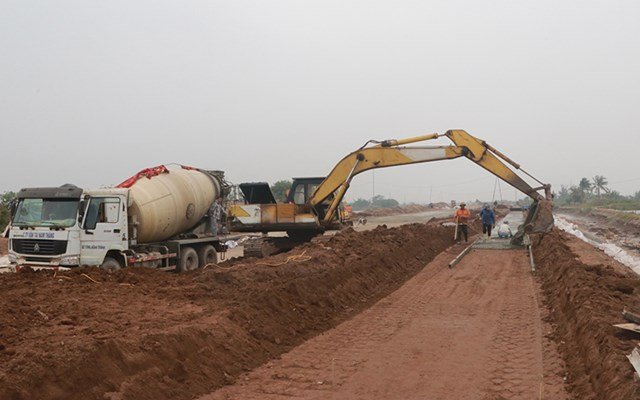 Tỉnh Nam Định đang cùng lúc triển khai một số công trình giao thông trọng điểm. Trong ảnh: Thi công tuyến đường trục kết nối vùng kinh tế biển của tỉnh với cao tốc Cầu Giẽ – Ninh Bình.
