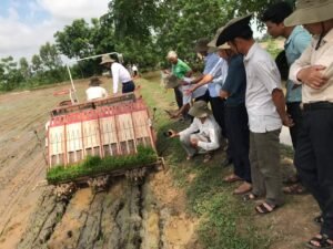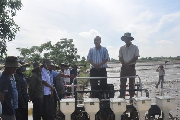 Sau khi nghe giới thiệu các đại biểu đã được tham quan trực tiếp hiệu quả sử dụng máy sạ cụm trên 5 sào ruộng ở thôn Thanh Thịnh, Yên Lợi. Việc sạ cụm tạo khoảng cách đều và thoáng sẽ giúp lúa tăng khả năng hấp thụ ánh sáng phát triển tốt hơn, hạn chế khả năng nhiễm các loại sâu bệnh, làm tăng năng suất, chất lượng gạo.