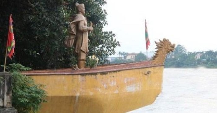 Tượng Chiêu Văn Vương Trần Nhật Duật đứng trước mũi tàu hướng trông dòng Lô được đặt tại bến Tam Giang (phường Bạch Hạc, thành phố Việt Trì). Ảnh: Tú Anh (baophutho.vn)