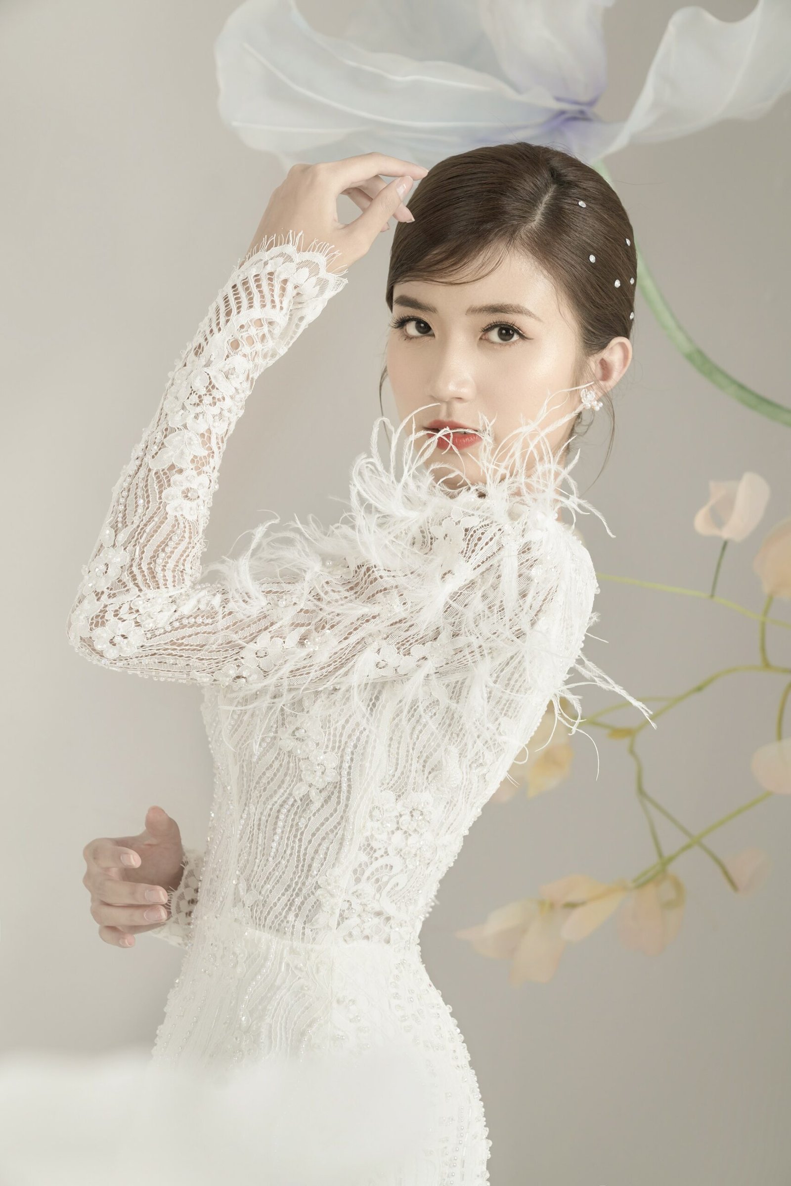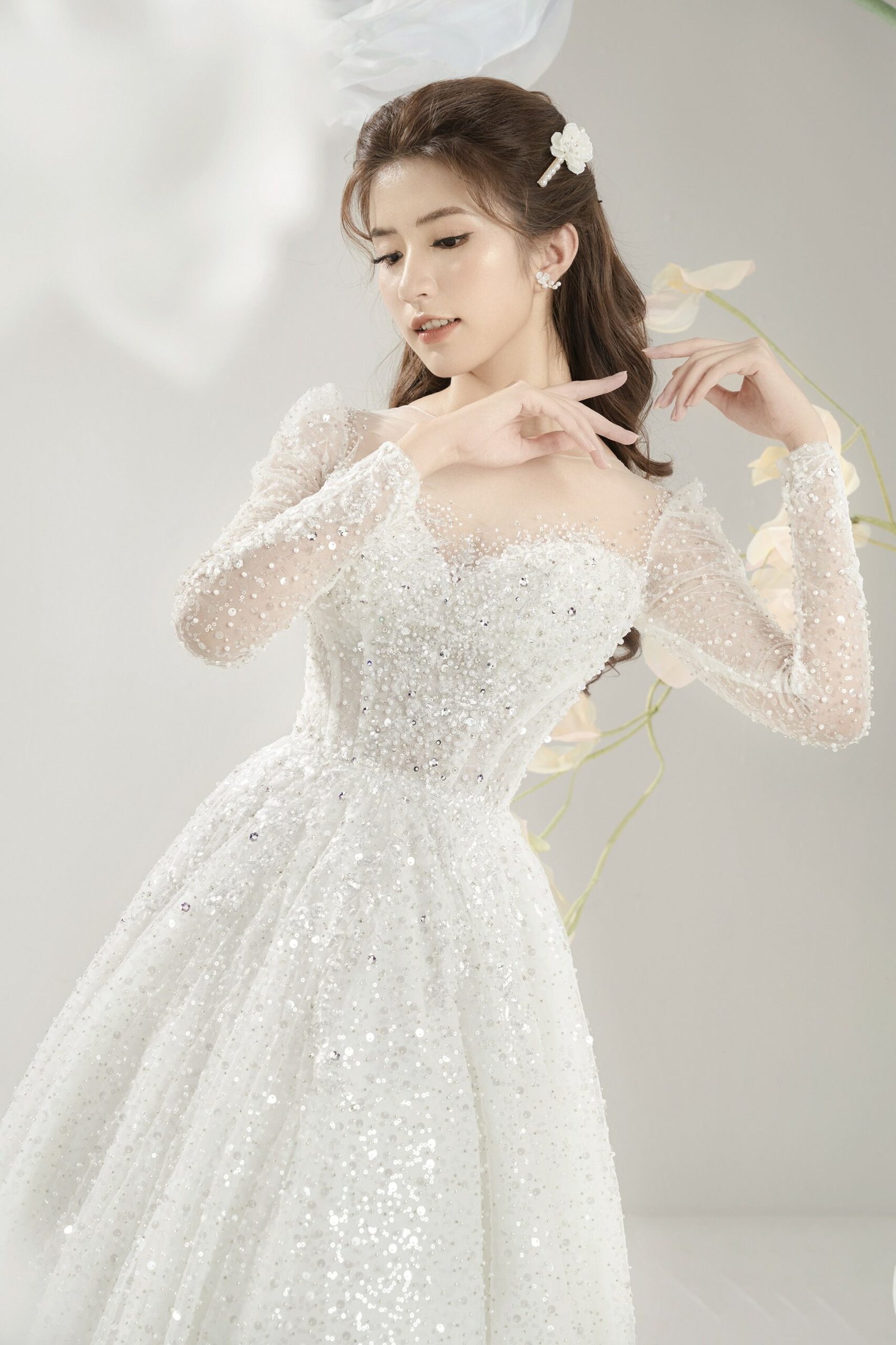 Chiếc váy cô dâu lấy cảm hứng từ hoa ly. NTK Quyên Nguyễn cho biết, hoa ly tượng trưng cho sự trong trắng và đức hạnh của người phụ nữ rất phù hợp với hình ảnh nàng dâu mới.