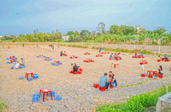 Trên các hội nhóm, fanpage, hình ảnh quán cà phê ruộng lúa đang được chia sẻ rộng rãi với lượt tương tác khủng. Được biết, vị trí quán thuộc tỉnh Trà Vinh. Toàn bộ “kiến trúc, diện tích” được đặt trên một thửa ruộng khô, với vài bộ bàn ghế được kê chuẩn “giãn cách” dọc theo cánh đồng.