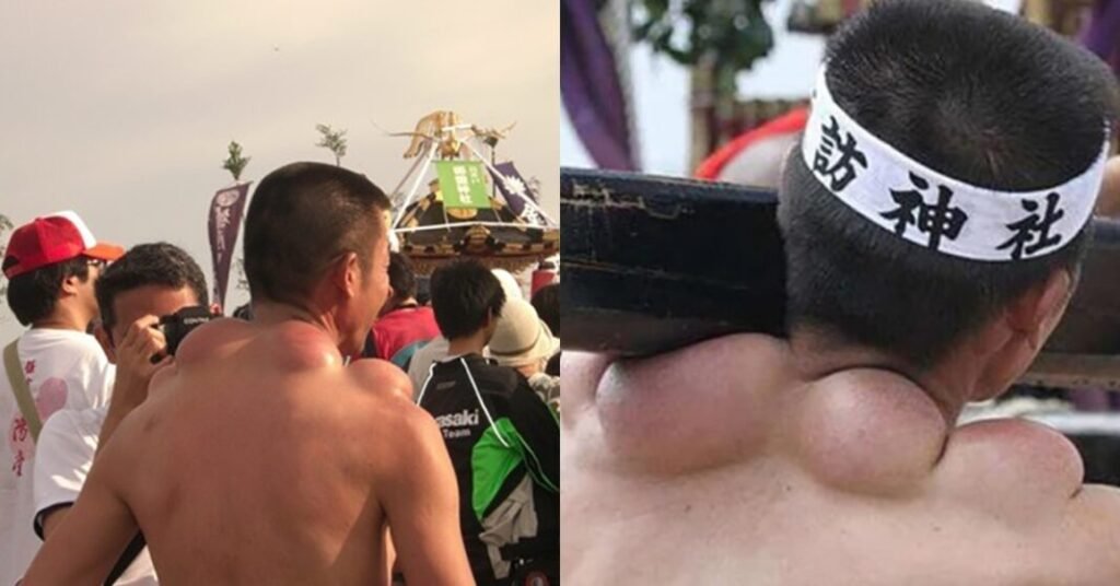 Mikoshi gây ra sức nặng khủng khiếp lên đôi vai của những thanh niên khiêng kiệu khiến máu không thể lưu thông. Qua năm tháng, cơ thể họ bắt đầu biến dạng, sưng phồng lên. Cộng với sự cọ xát liên tục, những vết u ngày càng xuất hiện nhiều, gồ lên như những chiếc bướu lạc đà.
