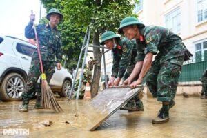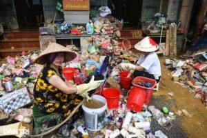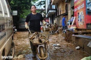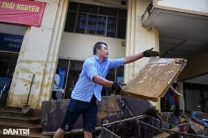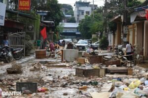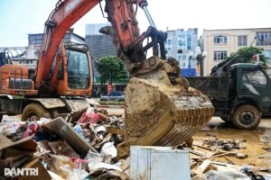 Sau lũ, tại đường Hoàng Văn Thụ, phường Phan Đình Phùng, tỉnh Thái Nguyên, rác thải chất đống, bên dưới là lớp bùn dày ngập mắt cá chân. Chính quyền đã huy động xe tải, máy xúc để thu gom rác.