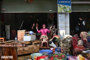 Bà cho biết, nước ngập hết tầng 1 nhiều ngày khiến gần như 90% các sản phẩm trong cửa hàng không thể sử dụng, chứ chưa nói đến việc có thể bán.