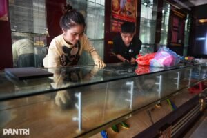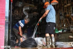 Trước lũ, chủ tiệm vàng Kim Tín trên đường Hoàng Văn Thụ đã kịp thu dọn, cất trữ toàn bộ tài sản. Hôm nay, chủ tiệm, trưởng quầy cùng tất cả nhân viên mỗi người một tay dọn dẹp cửa hàng.